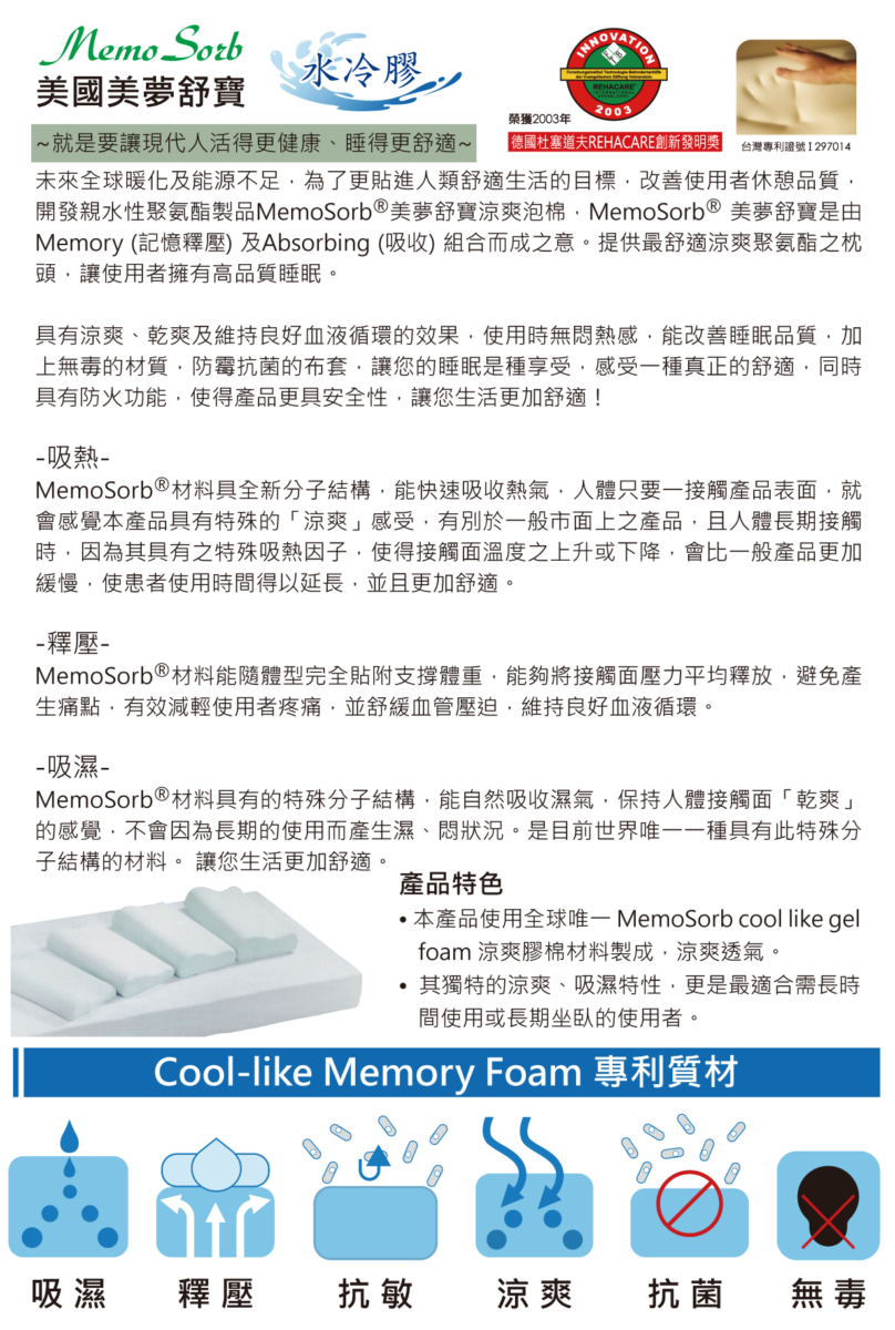 首頁 床墊知識 美國美夢舒寶水冷膠MemoSorb 美國美夢舒寶水冷膠MemoSorb 具有涼爽、乾爽及維持良好血液循環的效果,使用時無悶熱感,能改善睡眠品質,加上無毒的材質,防霉抗菌的布套,讓您的睡眠是種享受,感受一種真正的舒適。 上一 文章 比利時Artilat®乳膠 下一 文章 HR高彈力泡棉
